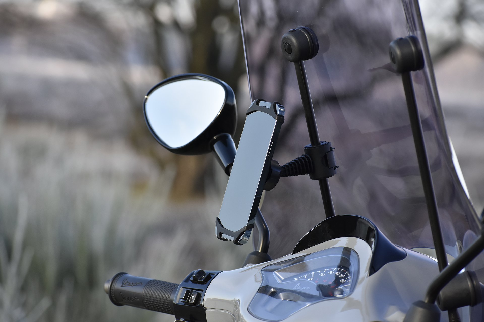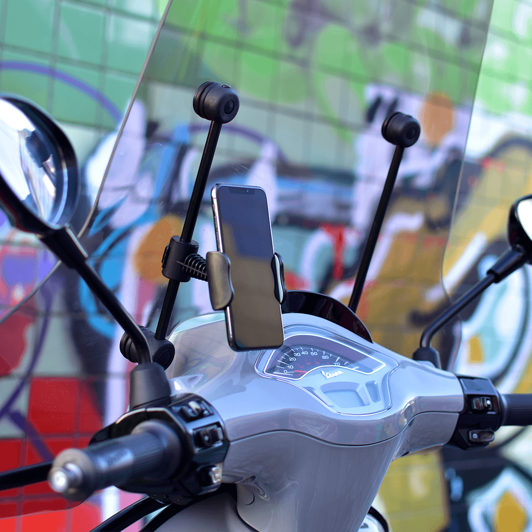 Of je nou een windscherm hebt of een spiegel, onze telefoonhouders passen op beide.