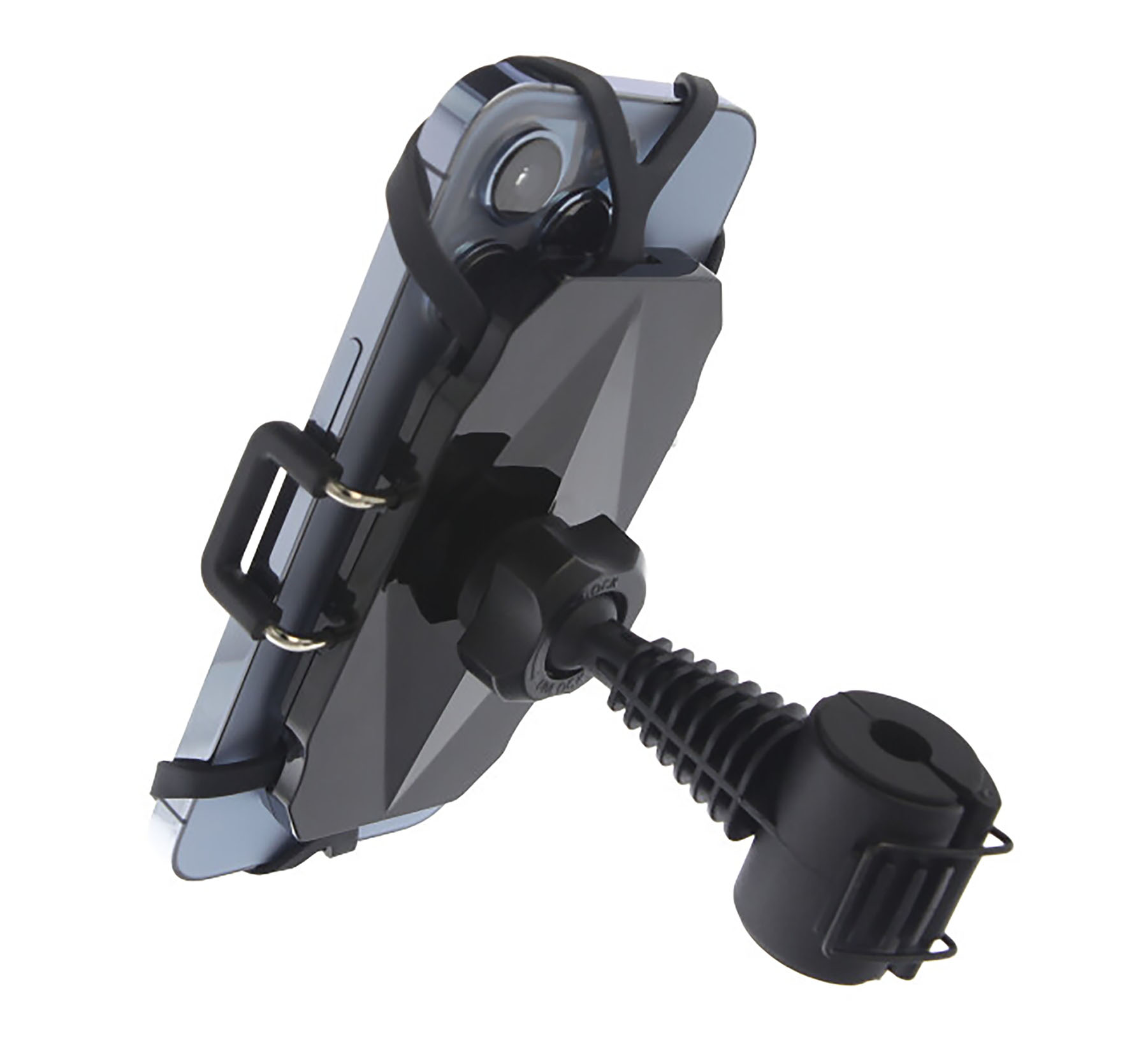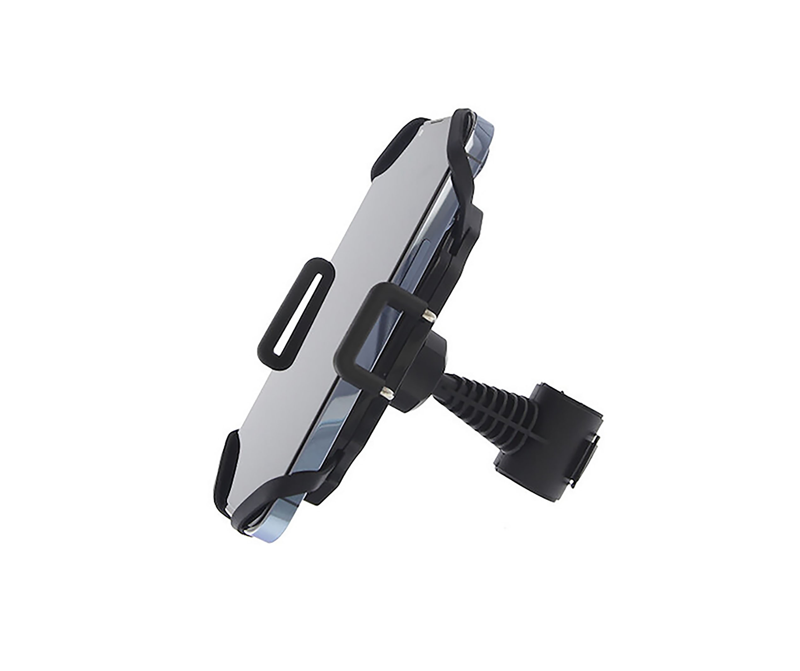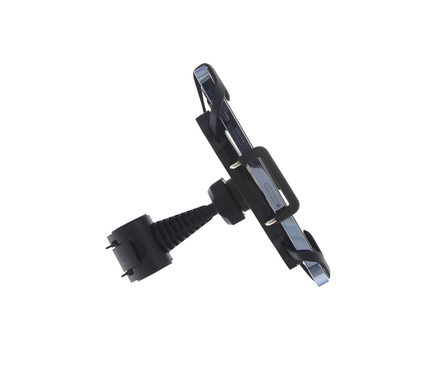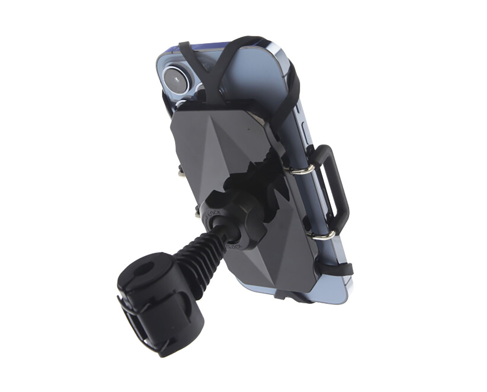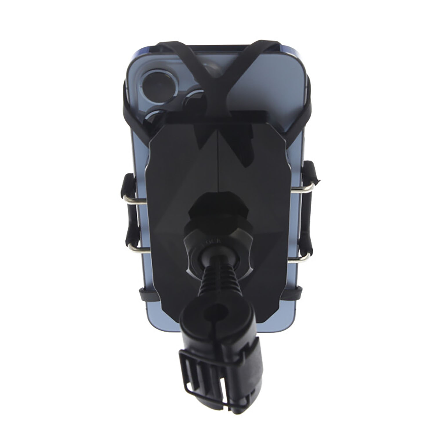 Deze telefoonhouder klemt de telefoon aan de zijkant en met elastiek in de hoeken waardoor deze houder extra veilig in gebruik is.