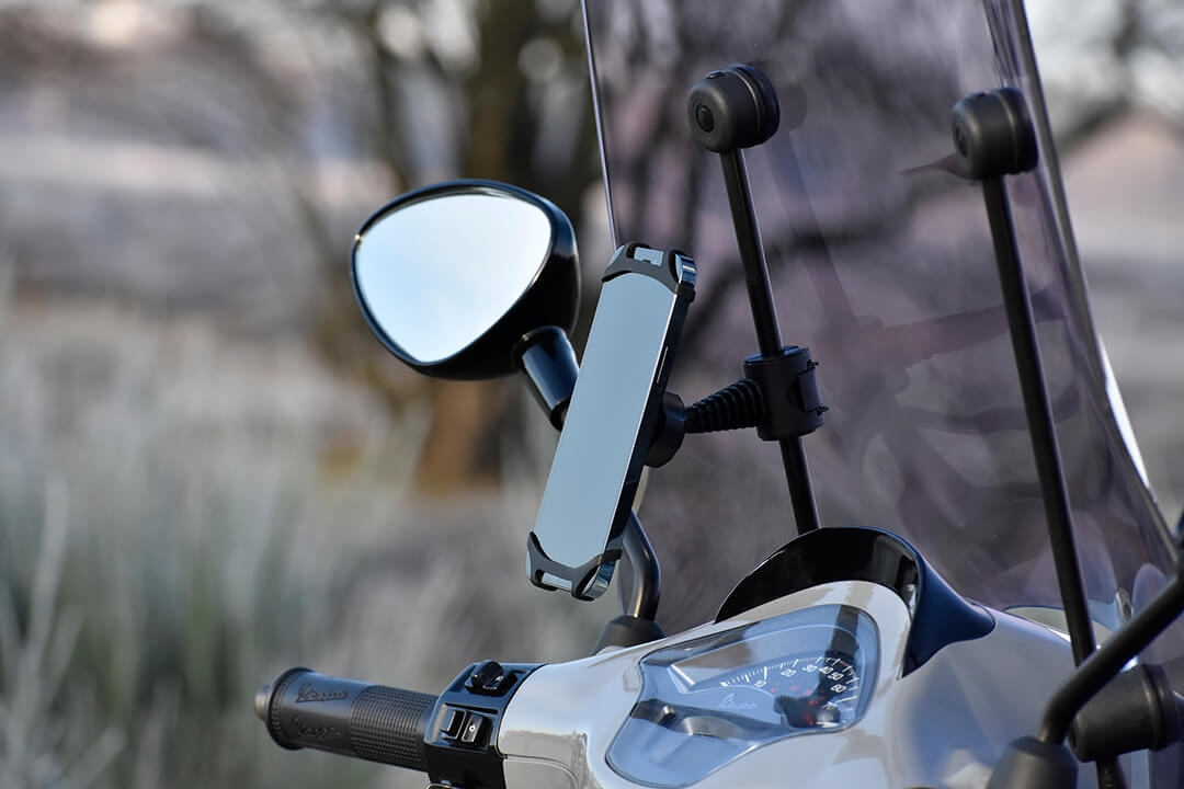 Heeft jouw scooter geen windscherm niet getreurd een telefoonhouder is sterk genoeg om hoge snelheden te kunnen doorstaan. Zorg er wel voor dat je regelmatig checkt of de telefoonhouder nog goed vast zit aan je spiegel.
